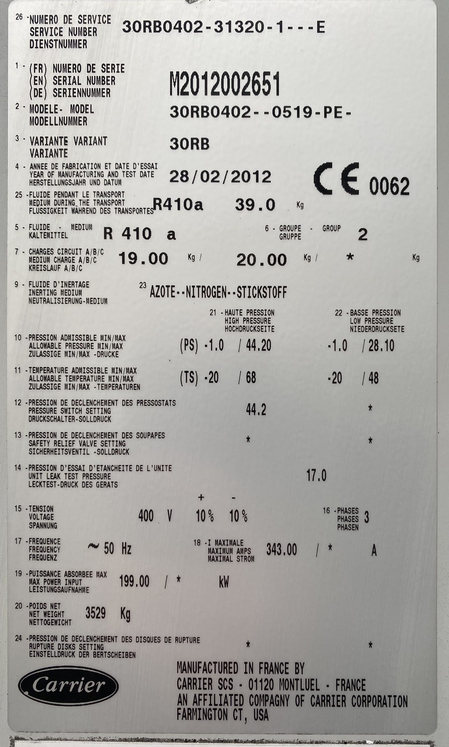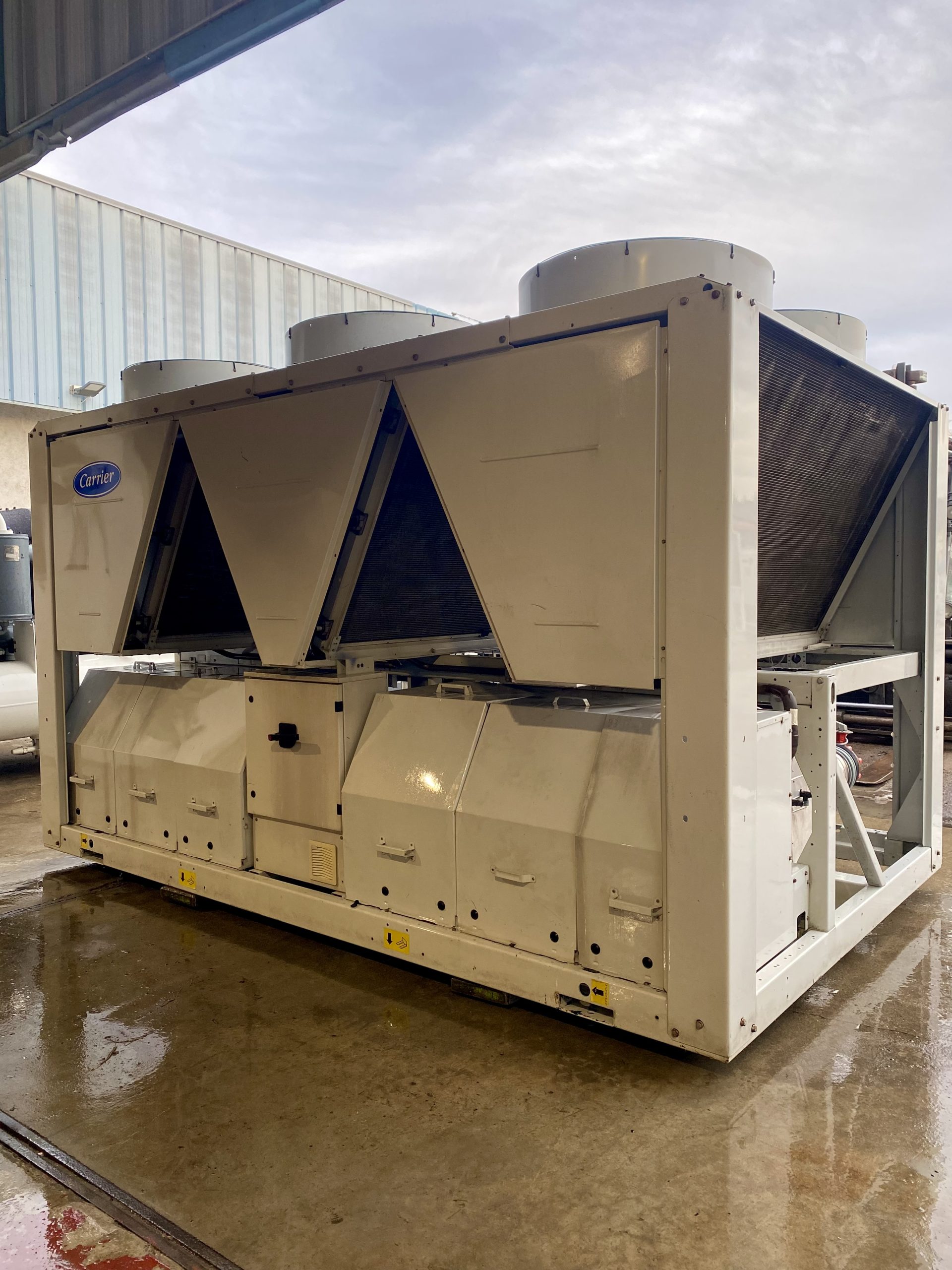 Second-hand CARRIER water-chiller in perfect condition. This used cooler is equipped with Scroll compressors and a brazed plate heat exchanger. It features variable-speed fan control as well as an integrated circulation pump.